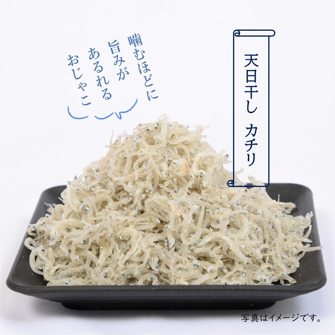 おひさまをたっぷり浴びたおじゃこは、昔から安芸の食卓の定番でした。カチリはシラスより少し大きく、食感は少しかためですが、噛むほどに旨味が増してきます。味つけはうす塩仕立て。懐かしいふる里のおじゃこです。